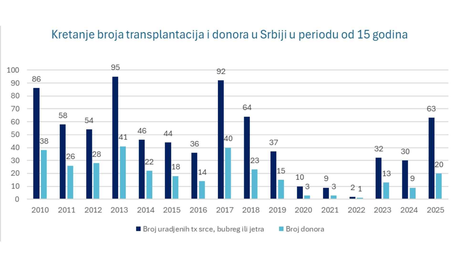 Подаци за 2024. годину, према којима су 63 пацијента преминула чекајући трансплантацију, док су 64 нова пацијента додата на листе чекања, указују на озбиљан и дугогодишњи проблем у функционисању система трансплантације у Србији. Управо зато је неопходно да се законске измене спроводе одговорно, транспарентно и уз пуно учешће јавности и стручне заједнице.