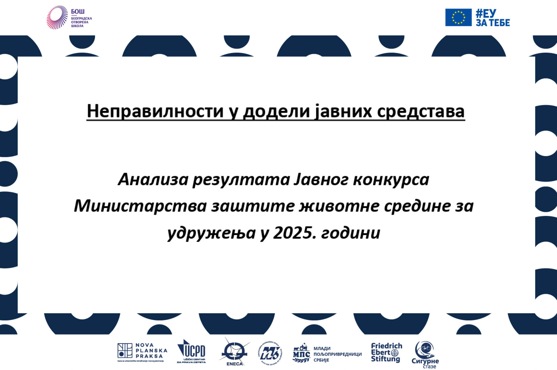 Анализа указује на бројне неправилности у поступку доделе средстава, укључујући подршку организацијама које не испуњавају формалне услове конкурса, недостатак транспарентности и ризике по финансијску одрживост организација цивилног друштва у области заштите животне средине.